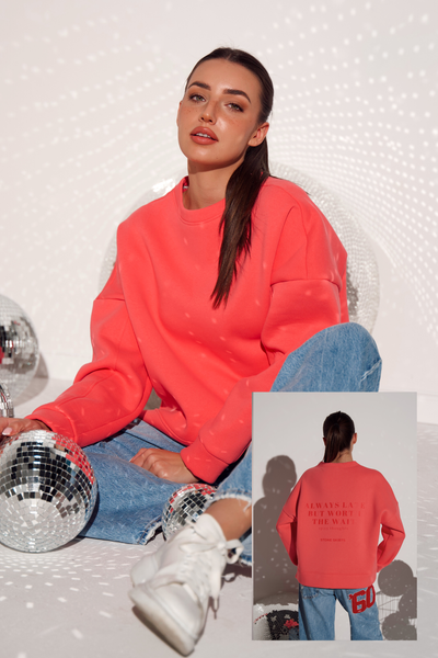 Z przodu prosta, czysta forma. Z tyłu subtelny, ale mocny napis „Always late but worth the wait”, który nadaje całości unikalnego charakteru i sprawia, że bluza przyciąga uwagę bez zbędnego krzyku. To propozycja dla kobiet, które cenią styl, jakość i świadome detale.